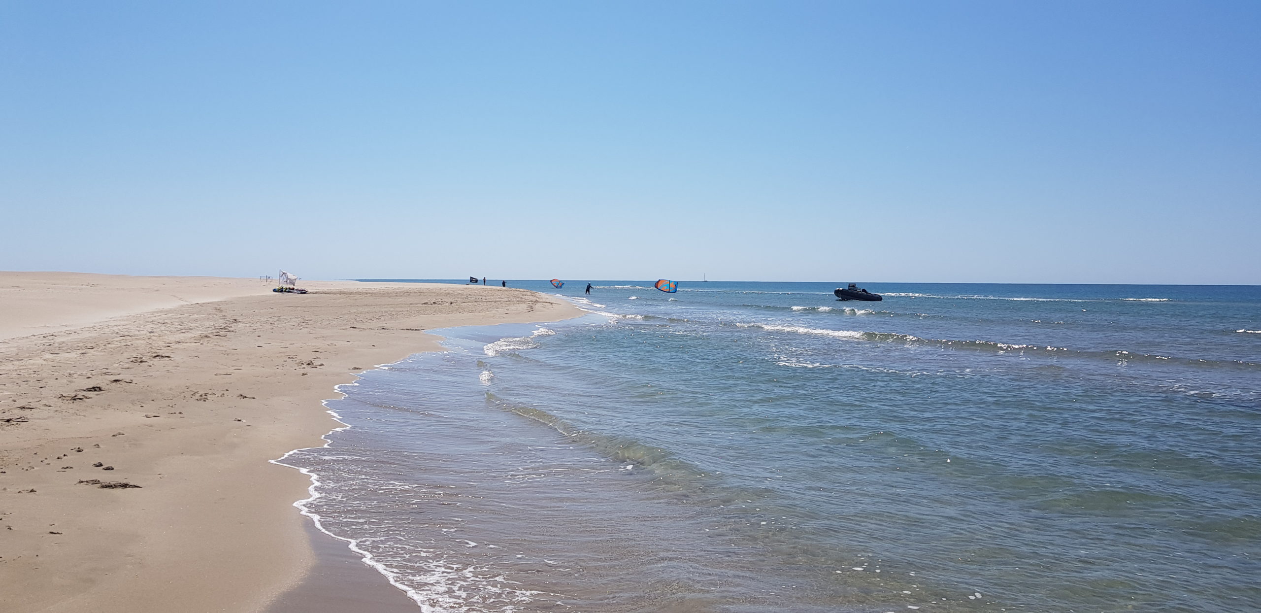 Certainement un des plus beaux spots du secteur avec ses 9 km de plage sauvage. Vent favorable de Sud-Ouest (brise thermique side on) et Nord-Ouest (Tramontane side off).